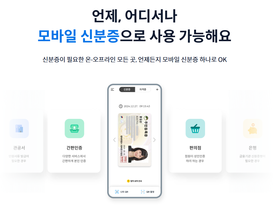 이제 주민등록증을 지갑에 넣고 다닐 필요 없이, 필요할 때마다 QR코드 하나로 간편하게 인증할 수 있습니다.