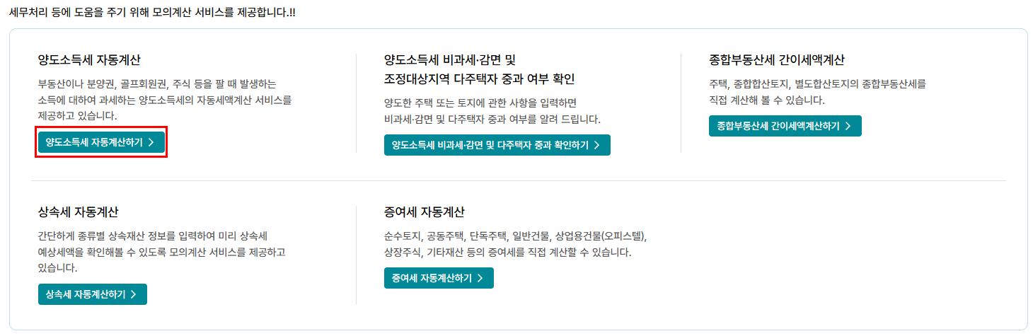 계산이 너무 어려우시다면 국세청 홈택스에서 손쉽게 양도소득세 자동 계산을 할 수 있습니다.